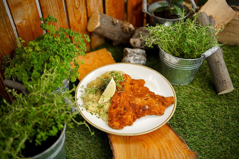 Panierte Schweineschnitzel, Bratensoße, Zitrone & Kartoffelsalat