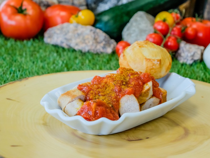 Unsere Curry-Wurst, Tomatensalsa & Minibrötchen