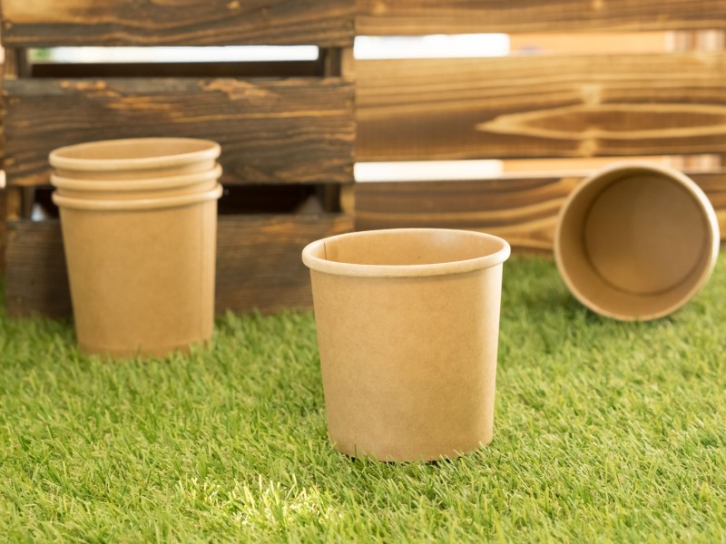 200 ml Papierbecher aus nachhaltiger Forstwirtschaft, Innenbeschichtung aus PLA (biologisch abbaubar). Inklusive Rührsticks aus Holz.